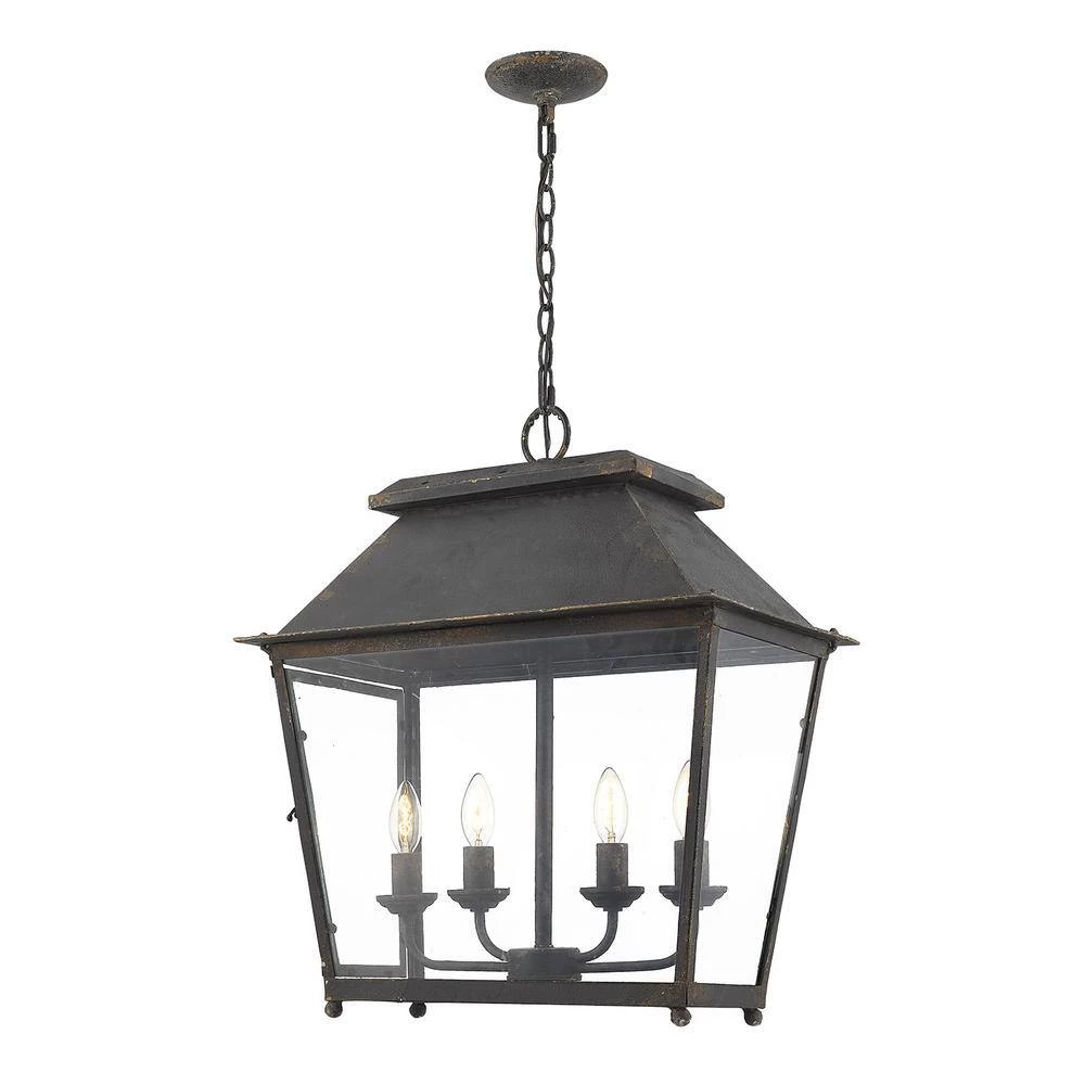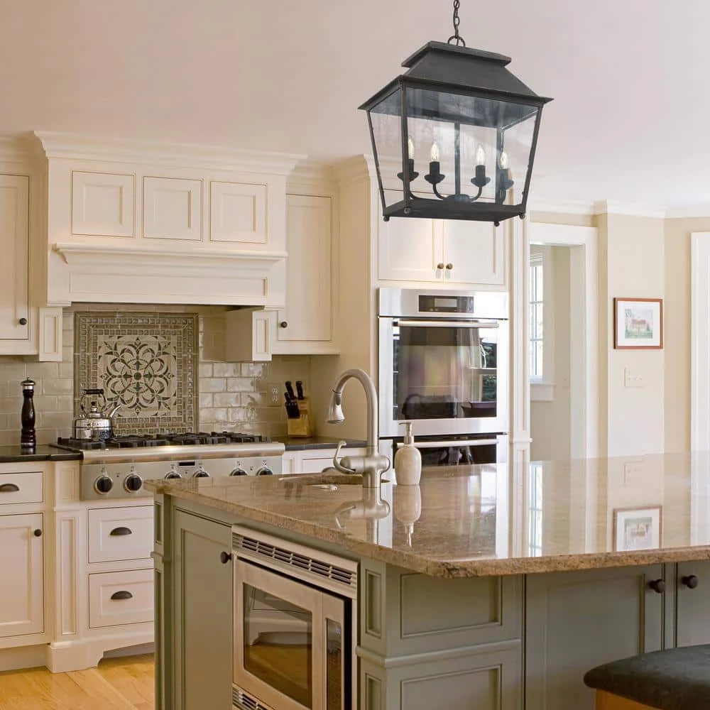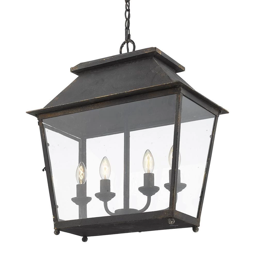 The Abingdon Collection features cozy, lantern style fixtures. This 4-light pendant is finished in rich, antique black iron which is layered on heavy, but looks a little weathered. The transitional style of this pendant will fit perfectly with your farmhouse design and it is available in 2 finishes. Pendants create stylish focal points and this 4-light pendant is comfortably sized for a cozy dining room, nook, or entry.