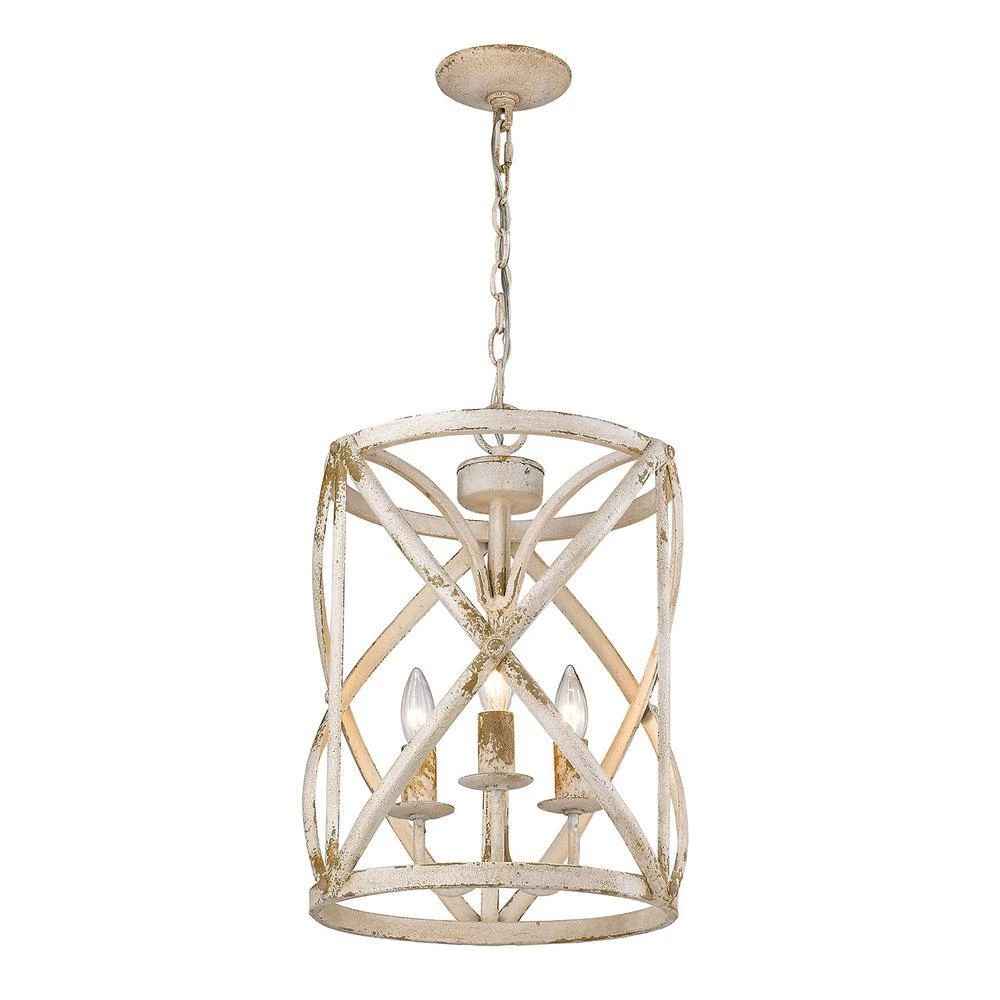 The Alcott Collection features cozy, barrel-style lanterns. This 3-light pendant is finished in a heavily-layered antique ivory and features a rusty, gold patina that takes you back in time. The transitional style of this pendant will fit perfectly with your farmhouse design and it is available in 2 finishes. Pendants create stylish focal points and this 3-light pendant is comfortably sized for a cozy dining room, nook, or entry.