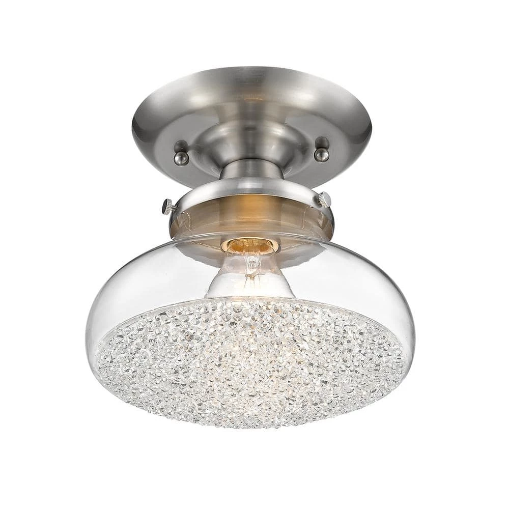 Add sparkle and style to your interior with this chic design. Asha is a contemporary mixture of transparent glass and brilliant crystals. Offered in an array of silhouettes, the collection features a sophisticated, satiny Pewter finish to complement the feminine flare of the industrial-inspired glass shades. The contoured hand-blown glass is fully enclosed and dipped in faceted crushed crystal gems. The brilliance of the sparkling crystal diffusers, clear glass and exposed bulbs create a stunning visual effect. The crystals and clear glass dramatically play with light, creating unique optical patterns while providing ample ambient lighting.