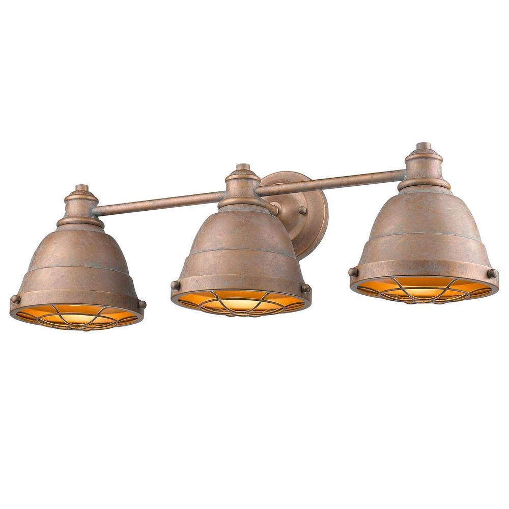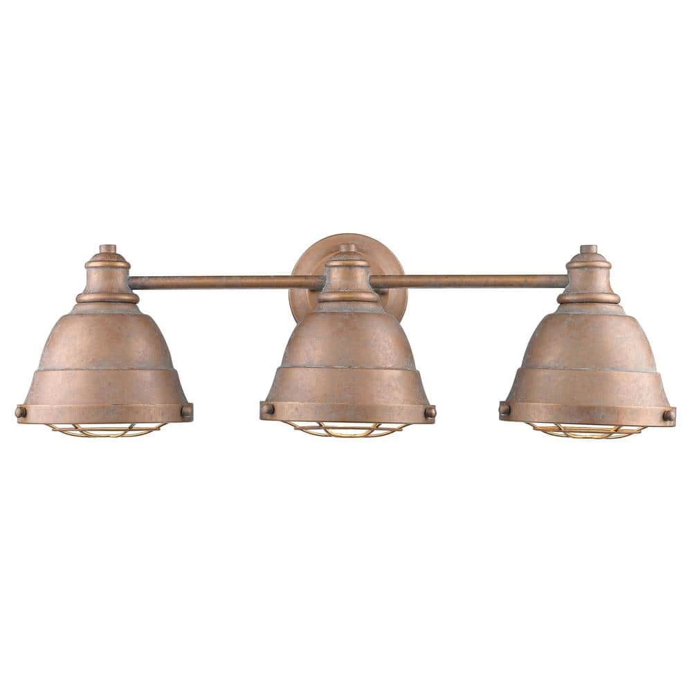 Golden Lighting’s Bartlett collection features industrial, vintage-inspired fixtures with simple, traditional silhouettes that are a nod to a bygone era. The collection features authentic details like caged diffusers and exposed hardware. The Copper Patina finish has antique Verdigris highlights. This 3 light bath vanity is UL approved damp locations.