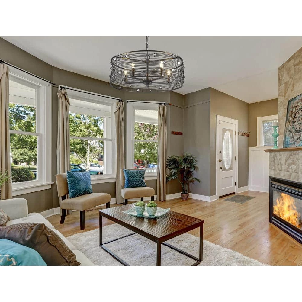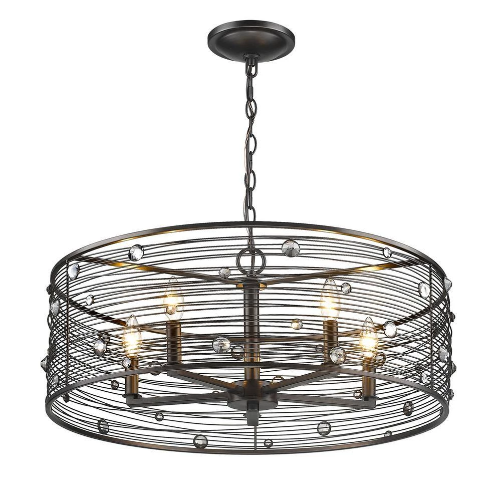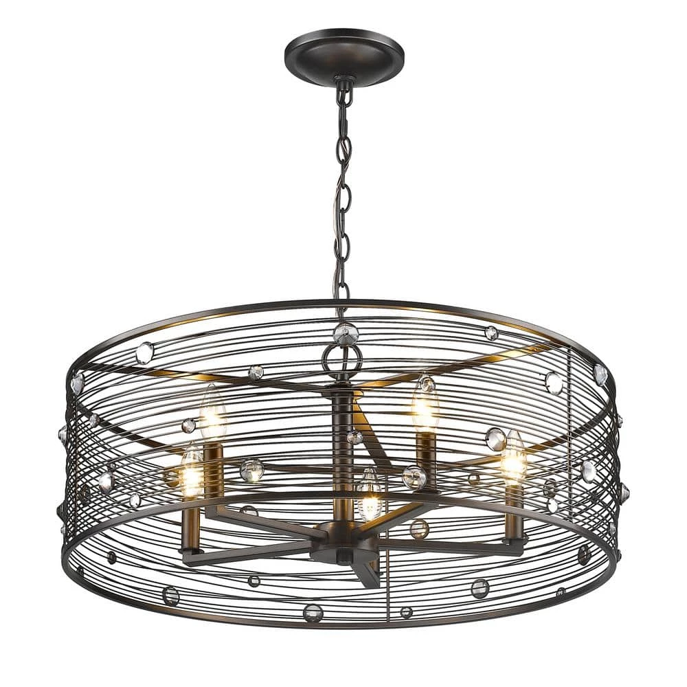 Bijoux is a jewelry-inspired collection of industrial-chic fixtures. Partially exposed bulbs shine coyly through hand-wrapped wire Shade, lighting the lustrous faceted crystals. A dark beauty, the collection features a hand-painted multi-layered Brushed Etruscan Bronze finish. Transitional in style, the fixtures are ideal for eclectic and contemporary room decors. Chandeliers create stylish focal points and this 5-light chandelier is comfortably sized for an intimate dining room or entry.