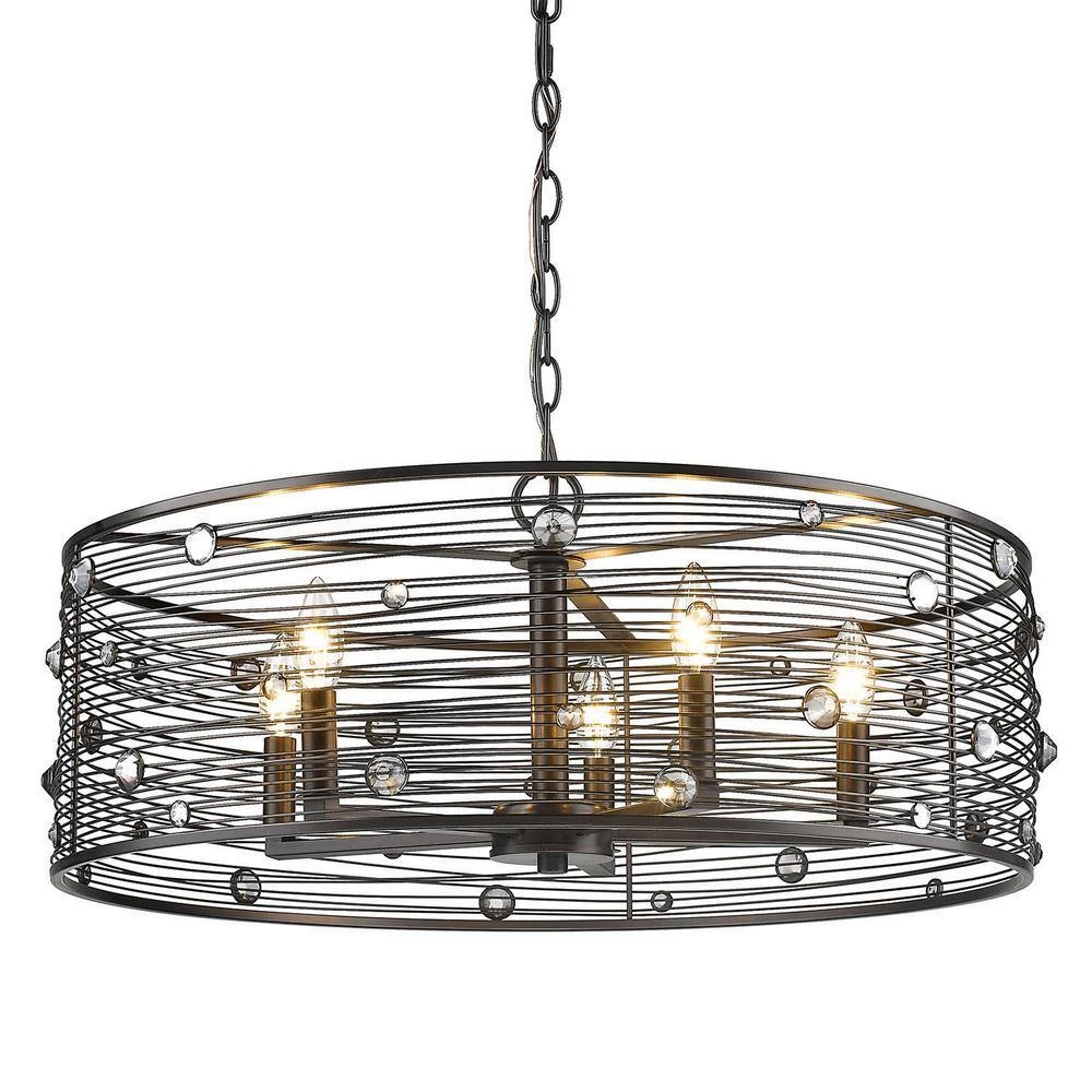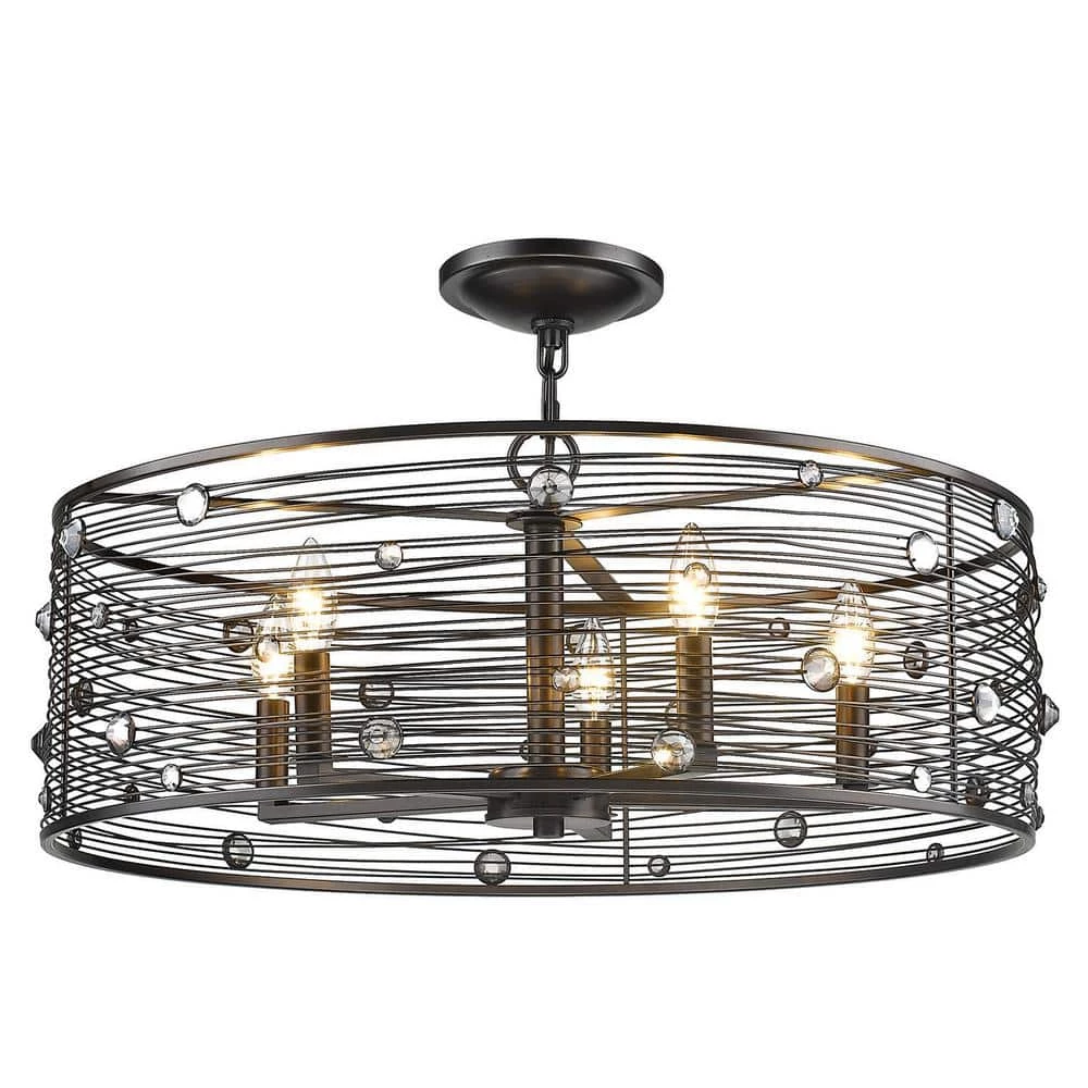 Bijoux is a jewelry-inspired collection of industrial-chic fixtures. Partially exposed bulbs shine coyly through hand-wrapped wire shades, lighting the lustrous faceted crystals. A dark beauty, the collection features a hand-painted multi-layered Brushed Etruscan Bronze finish. Transitional in style, the fixtures are ideal for eclectic and contemporary room decors. This 5-light semi-flush creates a stylish focal point that is comfortably sized for an intimate dining room or entry.
