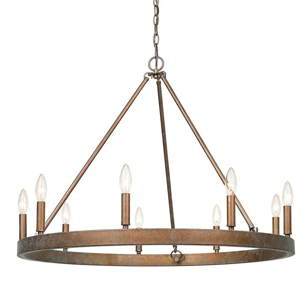 Carraway’s simplified form makes the collection perfect for transitional spaces. A rustic, hand-painted Copper Patina finish adds warmth, depth and dimension. Suspended from sturdy, steel rods, a circular hoop supports the tall candelabras. Dress the chandelier up with fancy bulbs or choose a more casual look. The exposed bulbs become a focal point.