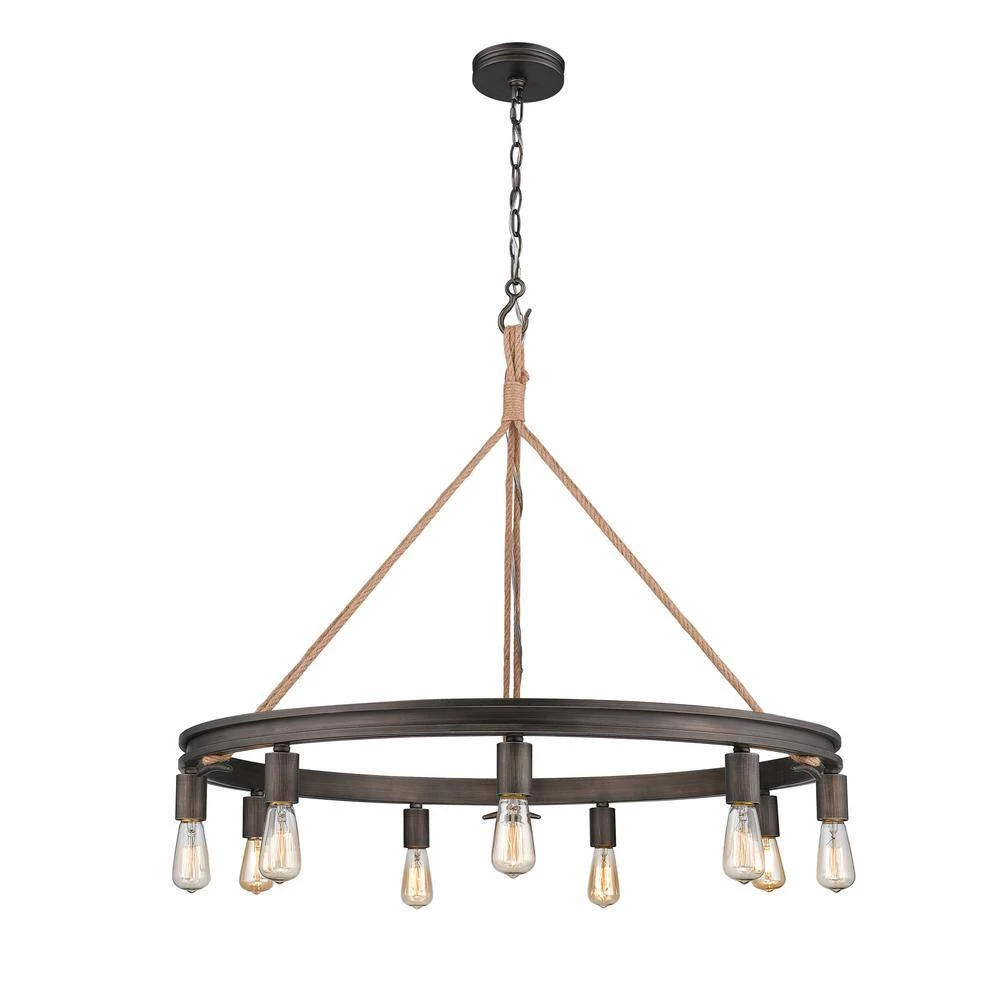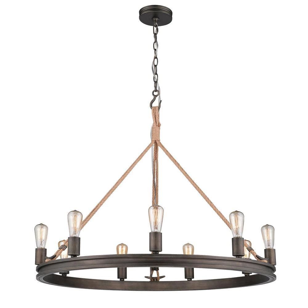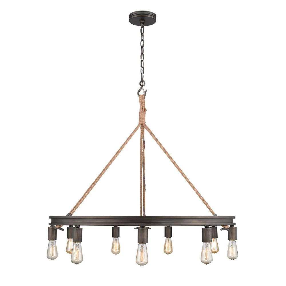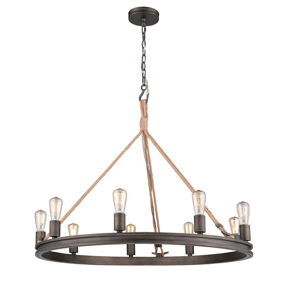 Inspired by the sea, this coastal collection features a simple design with authentic, nautical details. Tied in sailor’s knots, woven ropes loop metal cleats before being suspended from maritime hooks. The contrast between the color and texture of the rope and metalwork creates visual interest. Created to be hung with the lamps facing up or down, the transitional fixtures are versatile. This look is perfect for seaside retreats, casual lofts and rustic bungalows. This 9-Light chandelier creates a dramatic focal point and is graciously sized for larger living and dining areas.