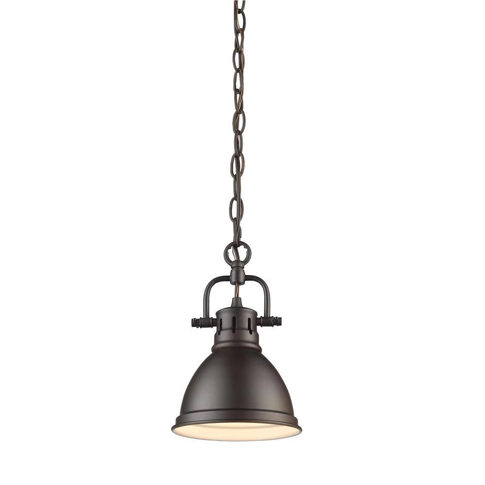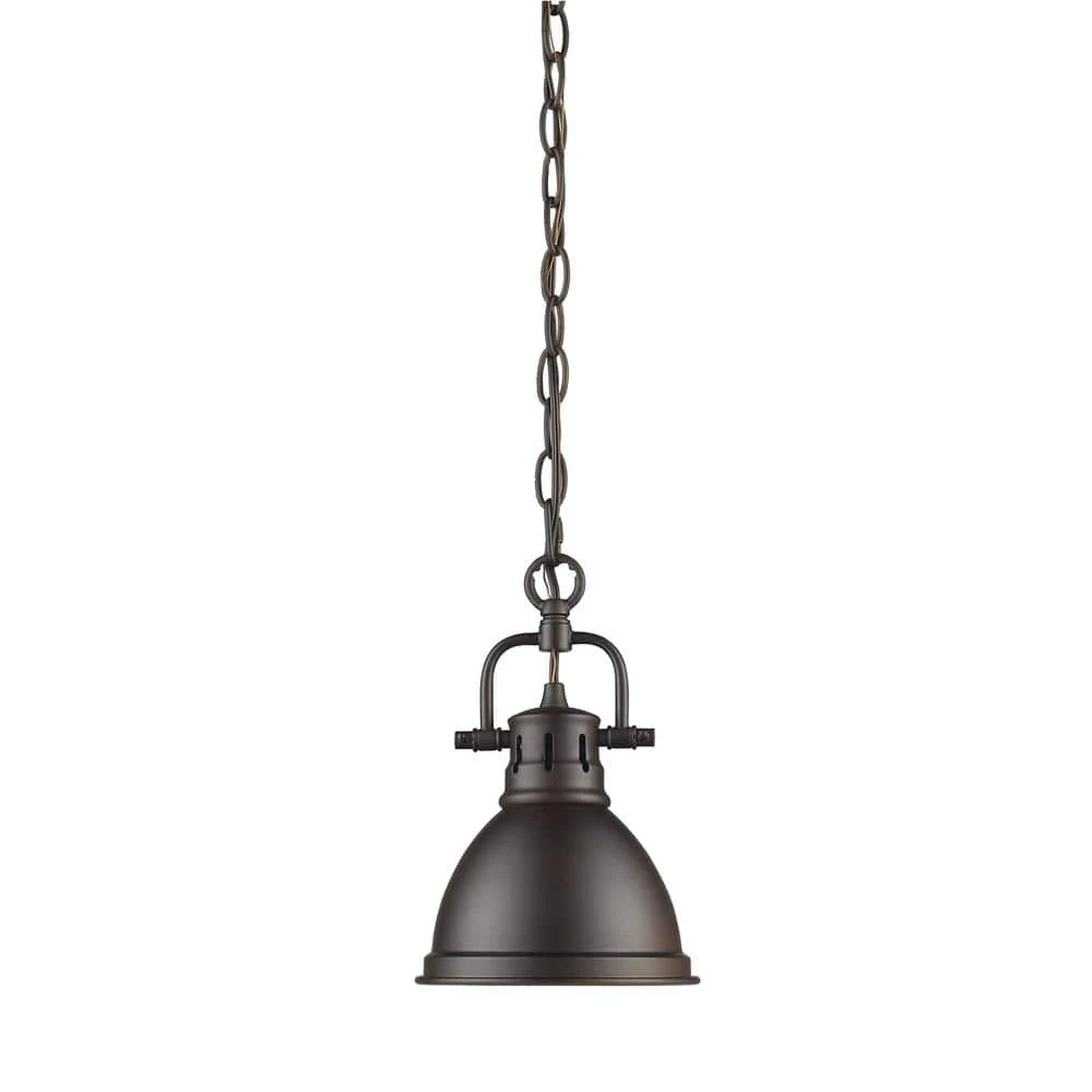 Transform the look of your room with this classic, vintage-inspired fixture by Golden Lighting. Golden Lighting’s Duncan collection is contemporary style with an industrial feel. The collection features a variety of simple, traditional silhouettes that are a nod to a bygone era. A variety of plated and painted metal shade finishes are offered in combination with durable Aged Brass, Chrome or Pewter fixture bodies. Rubbed Bronze fixtures are paired with Rubbed Bronze shades. This chain-hung mini pendant features a may be hung individually or grouped over a bar.