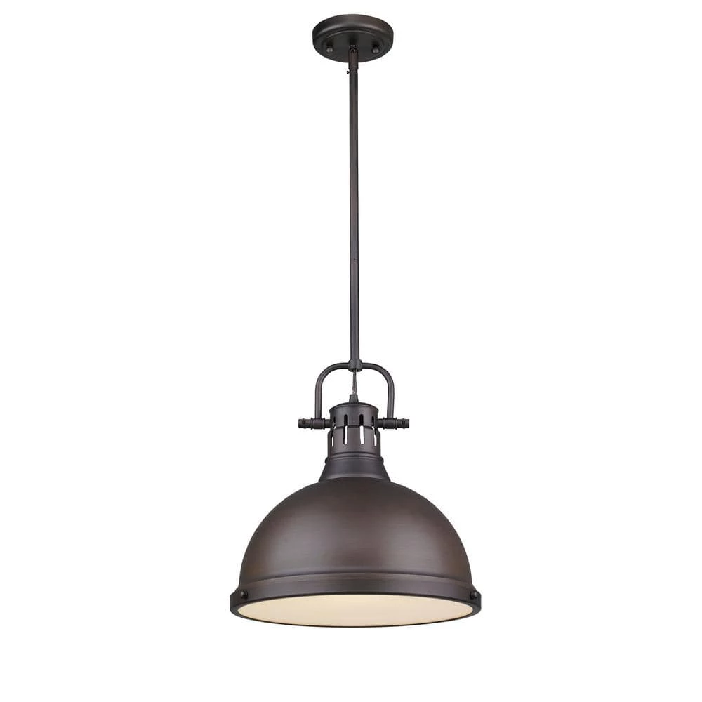 Transform the look of your room with this classic, vintage-inspired fixture by Golden Lighting. Golden Lighting’s Duncan collection is contemporary style with an industrial feel. The collection features a variety of simple, traditional silhouettes that are a nod to a bygone era. A variety of plated and painted metal shade finishes are offered in combination with durable Aged Brass, Chrome or Pewter fixture bodies. Rubbed Bronze fixtures are paired with Rubbed Bronze shades. This large, rod-hung pendant features a glass diffuser and is comfortably sized for a small nook or island. The pendant may be hung individually or arrayed as a set.