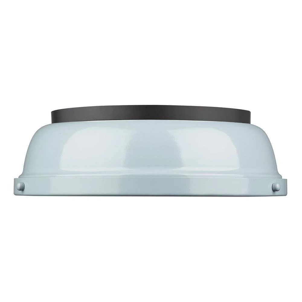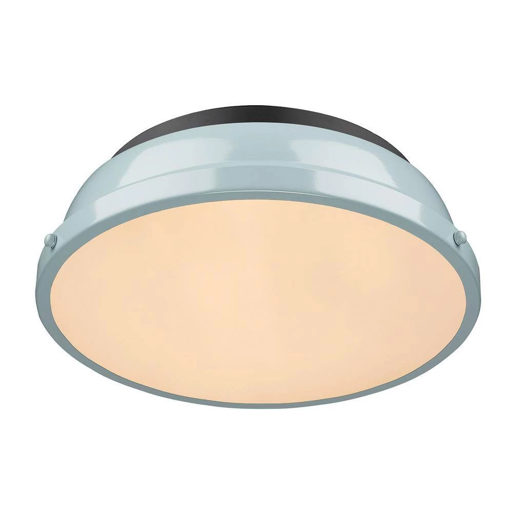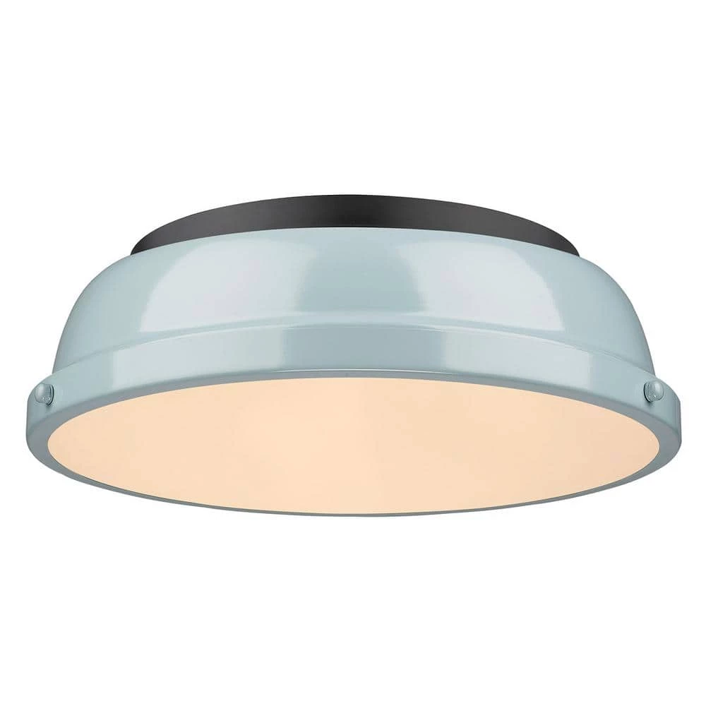 Transform the look of your room with this classic, vintage-inspired fixture by Golden Lighting. Golden Lighting’s Duncan collection is contemporary style with an industrial feel. The collection features a variety of simple, traditional silhouettes that are a nod to a bygone era. A variety of plated and painted metal shade finishes are offered in combination with durable Aged Brass, Black, Chrome or Pewter fixture bodies. The Rubbed Bronze fixtures are paired with Rubbed Bronze shades. This flush mount is perfect for modern or contemporary style home decors. It works perfectly in a kitchen, hallway or bath and is UL approved for damp locations. This matte black flush mount is paired with a seafoam shade. The shade is a glossy, pale aqua.