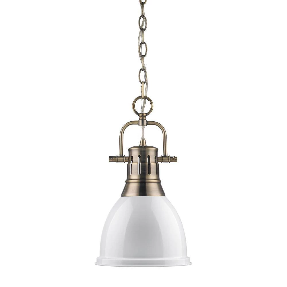 Transform the look of your room with this classic, vintage-inspired fixture, the Duncan collection is contemporary style with an industrial feel. The collection features a variety of simple, traditional silhouettes that are a nod to a bygone era. A variety of plated and painted metal shade finishes are offered in combination with durable Aged Brass, Black, Chrome or Pewter fixture bodies. The Rubbed Bronze fixtures are paired with Rubbed Bronze shades. This small, chain-hung pendant features a may be hung individually or grouped over a bar. This aged brass small pendant with chain is paired with a white shade. The shade is a glossy, bright white.