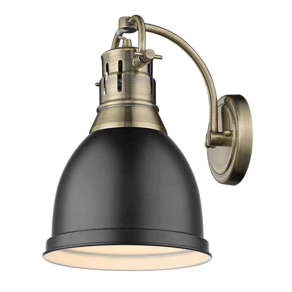 Transform the look of your room with this classic, vintage-inspired fixture by Golden Lighting. Golden Lighting’s Duncan collection is contemporary style with an industrial feel. The collection features a variety of simple, traditional silhouettes that are a nod to a bygone era. A variety of plated and painted metal shade finishes are offered in combination with durable Aged Brass, Black, Chrome or Pewter fixture bodies. The Rubbed Bronze fixtures are paired with Rubbed Bronze shades. This 1-light wall sconce is perfect for modern or contemporary style home decors. It works well in a hallway or bath and is UL approved for damp locations. This aged brass 1-light wall sconce is paired with a matte black shade. The shade is a soft, matte black.