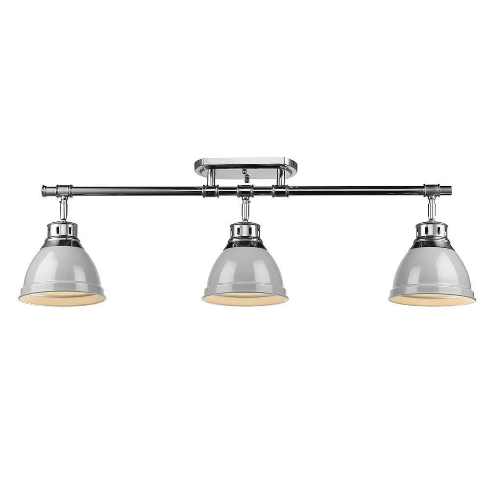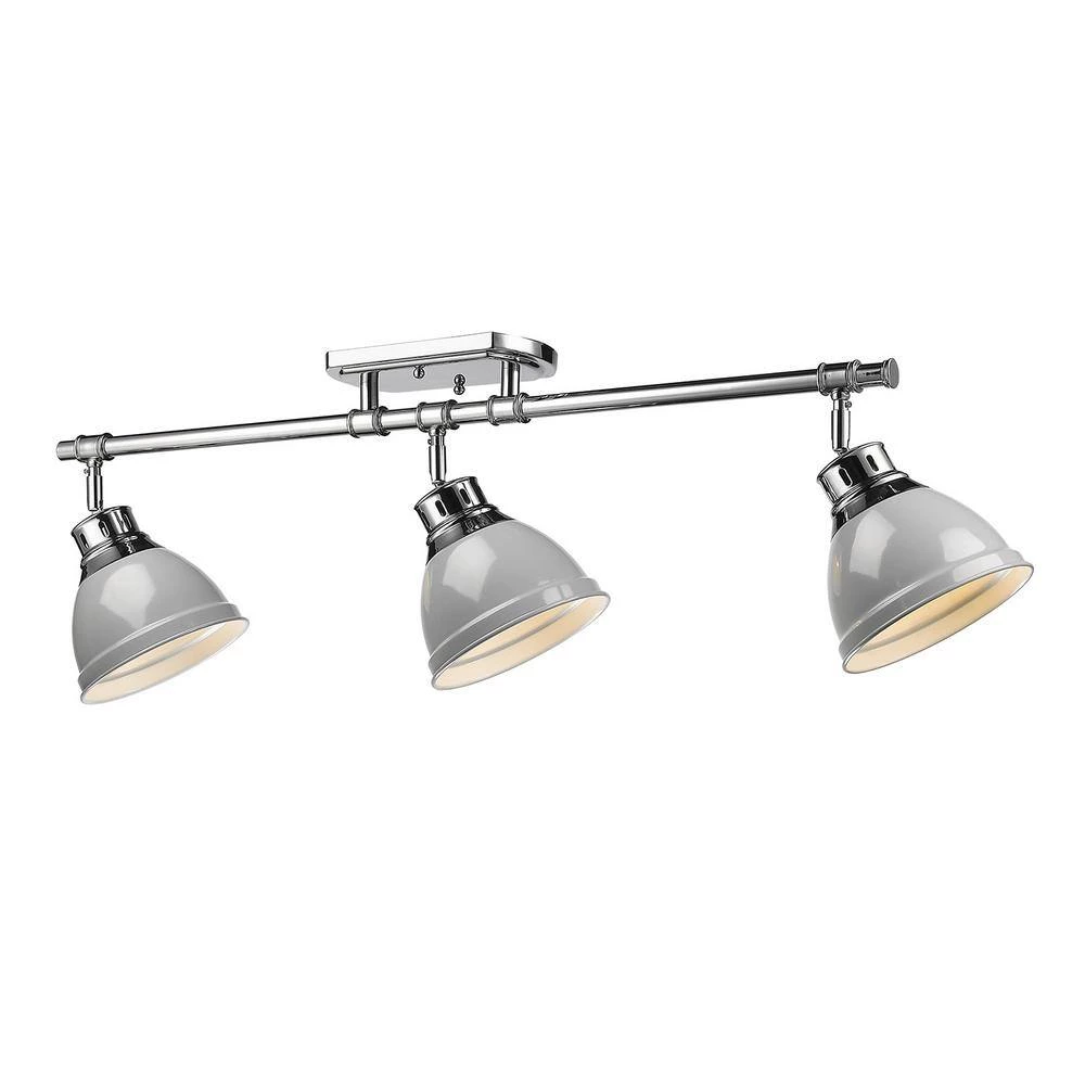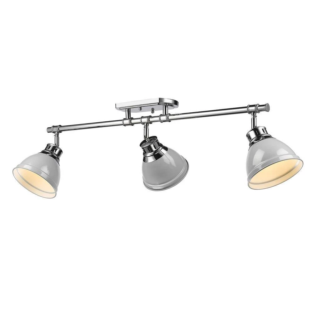 Transform the look of your room with this classic, vintage-inspired fixture by Golden Lighting. Golden Lighting’s Duncan collection is contemporary style with an industrial feel. The collection features a variety of simple, traditional silhouettes that are a nod to a bygone era. A variety of plated and painted metal shade finishes are offered in combination with durable Aged Brass, Black, Chrome or Pewter fixture bodies. The Rubbed Bronze fixtures are paired with Rubbed Bronze shades. This 3-light semi-flush is highly versatile and maneuverable. The swivel on the canopy moves 90 degrees allowing the fixture to be mounted on the wall or ceiling. The fixture’s shades can also be positioned freely. This shiny chrome 3-light semi-flush track light is paired with gray shades. The shades are a soft, glossy medium gray.