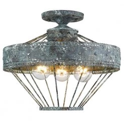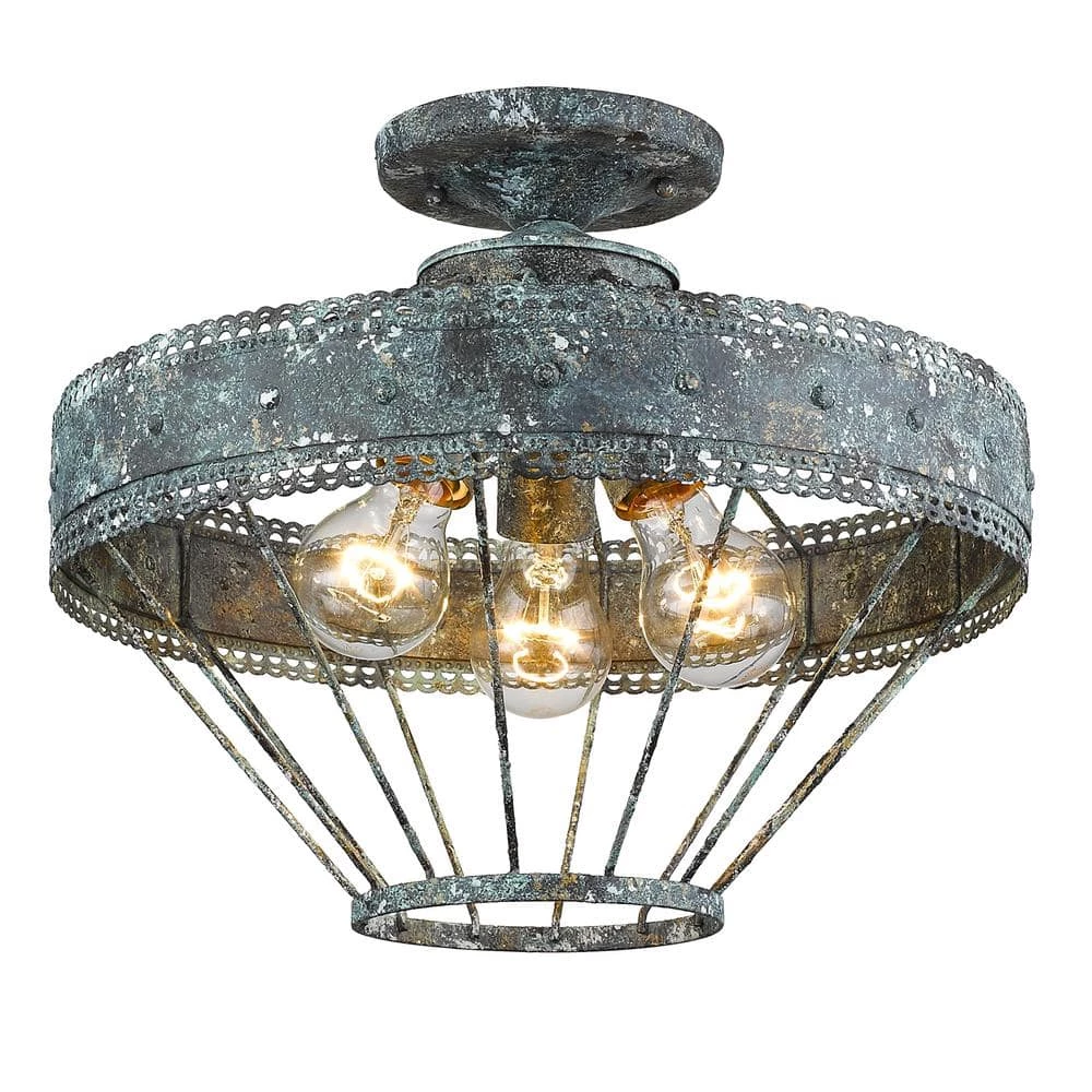 Ferris is a casual, vintage-inspired design that was created for eclectic or farmhouse decors. The unique metal work features a scallop detail and a multi-layered, hand-painted finish. The blue verdigris patina finish is applied with white and gold accent to create a chic, but weathered look. The hanging fixtures include 12 of chunky, round decorative chain. This semi-flush creates a generous open area for widespread ambient-lighting.