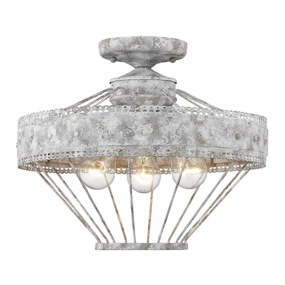 Ferris is a casual, vintage-inspired design that was created for eclectic or farmhouse decors. The unique metal work features a scallop detail and a multi-layered, hand-painted finish. The multi-layered oyster finish is applied with white and gold accents to create a chic, but weathered look. This semi-flush creates a generous open area for widespread ambient-lighting.