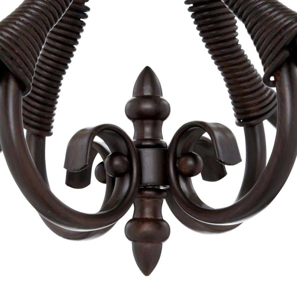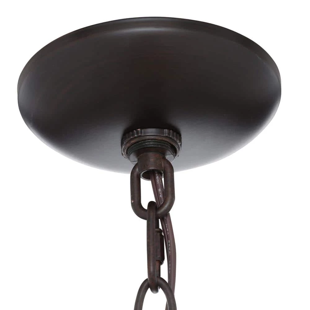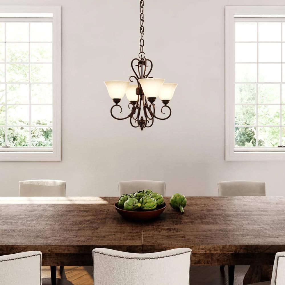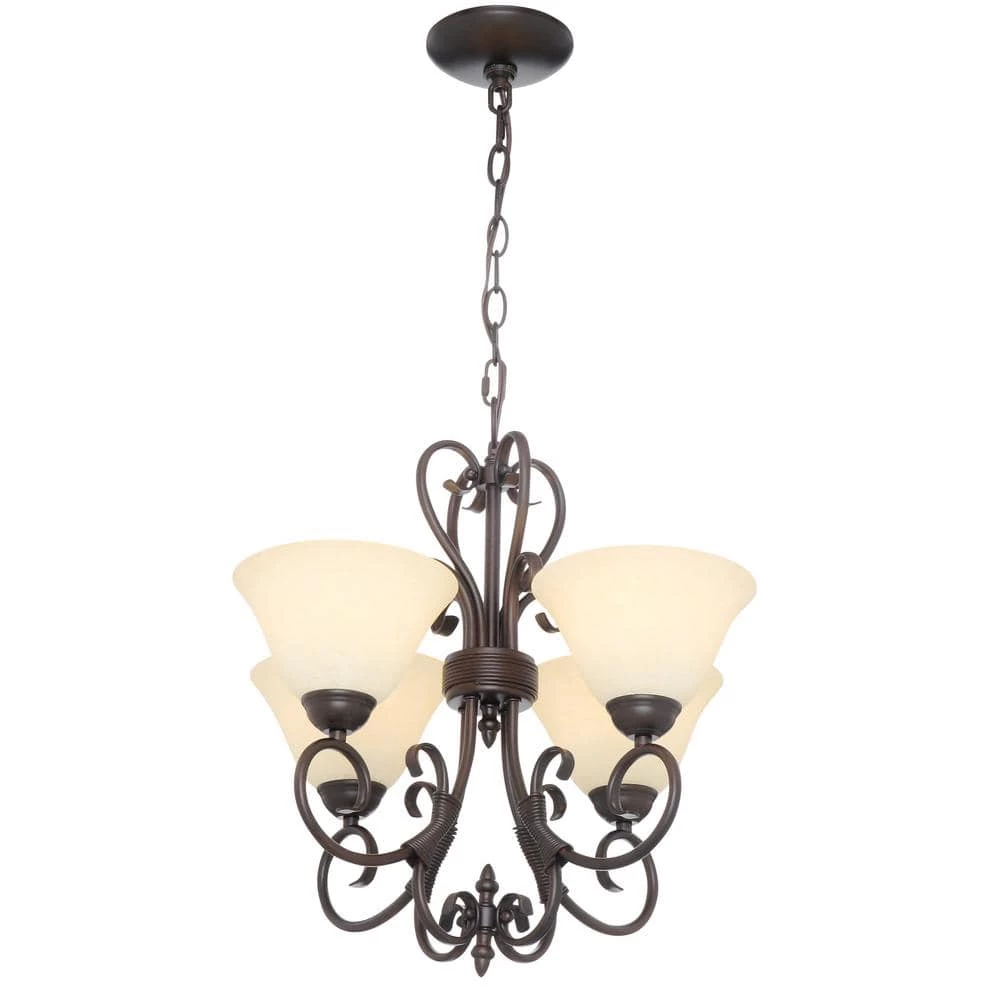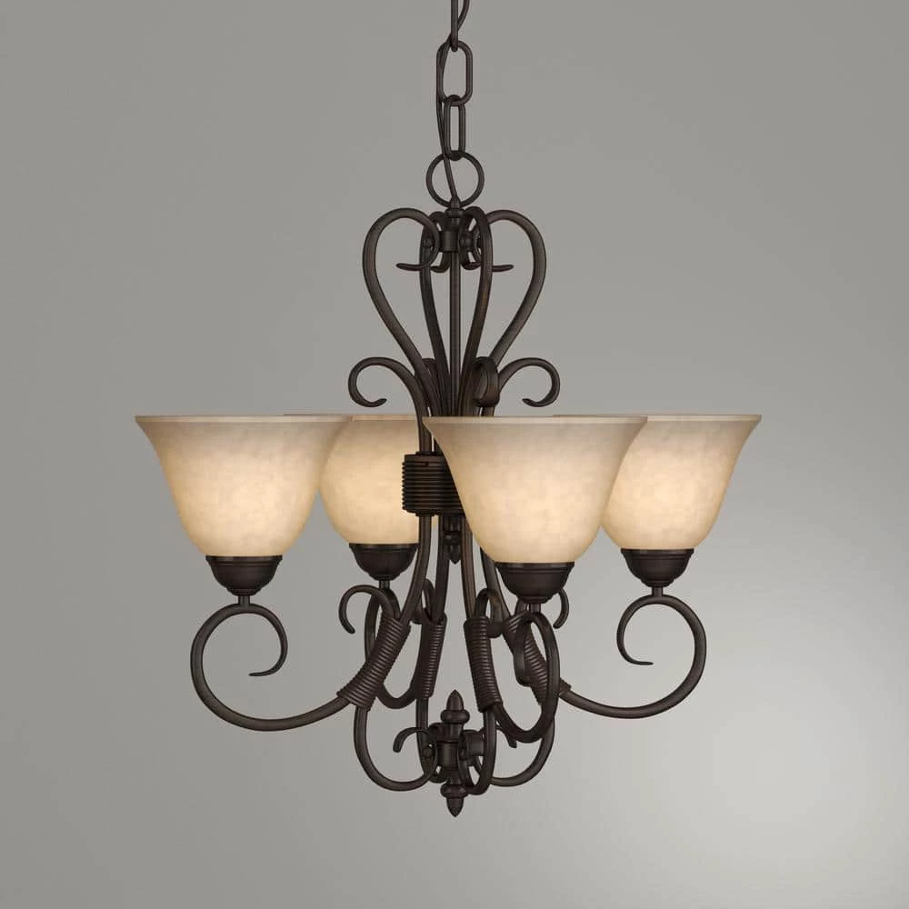 Earthy tones and organic lines make the Homestead collection four-light chandelier a classic addition to the transitional style home. Whether the decor is eclectic, casual or traditional, this piece will blend. Its deep, rubbed bronze finish gives depth and weight to the delicately curved arms, partnering perfectly with the warm tea stone to create a rich effect. Using four 60-Watt incandescent bulbs, this mini chandelier creates a stylish focal point and warm ambient lighting perfect for intimate living and dining areas or task lighting.