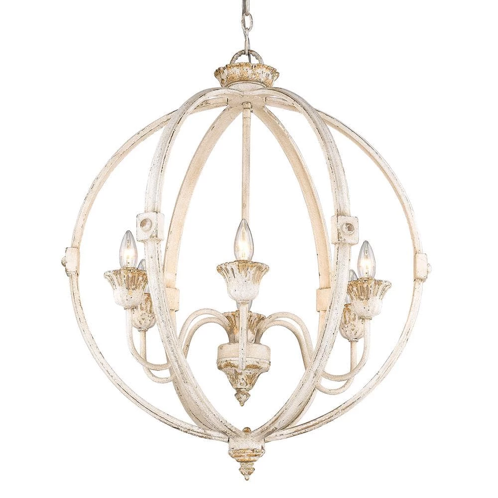 The Jules Collection features cozy spherical chandeliers. This 6-light chandelier is finished in a heavily-layered antique ivory and features a rusty, gold patina that takes you back in time. This light colored chandelier gives off an upbeat ambiance as the candle-style arms hold bulbs in the middle. Chandeliers create stylish focal points and this six-light is comfortably sized for a dining room, living room, or entry.