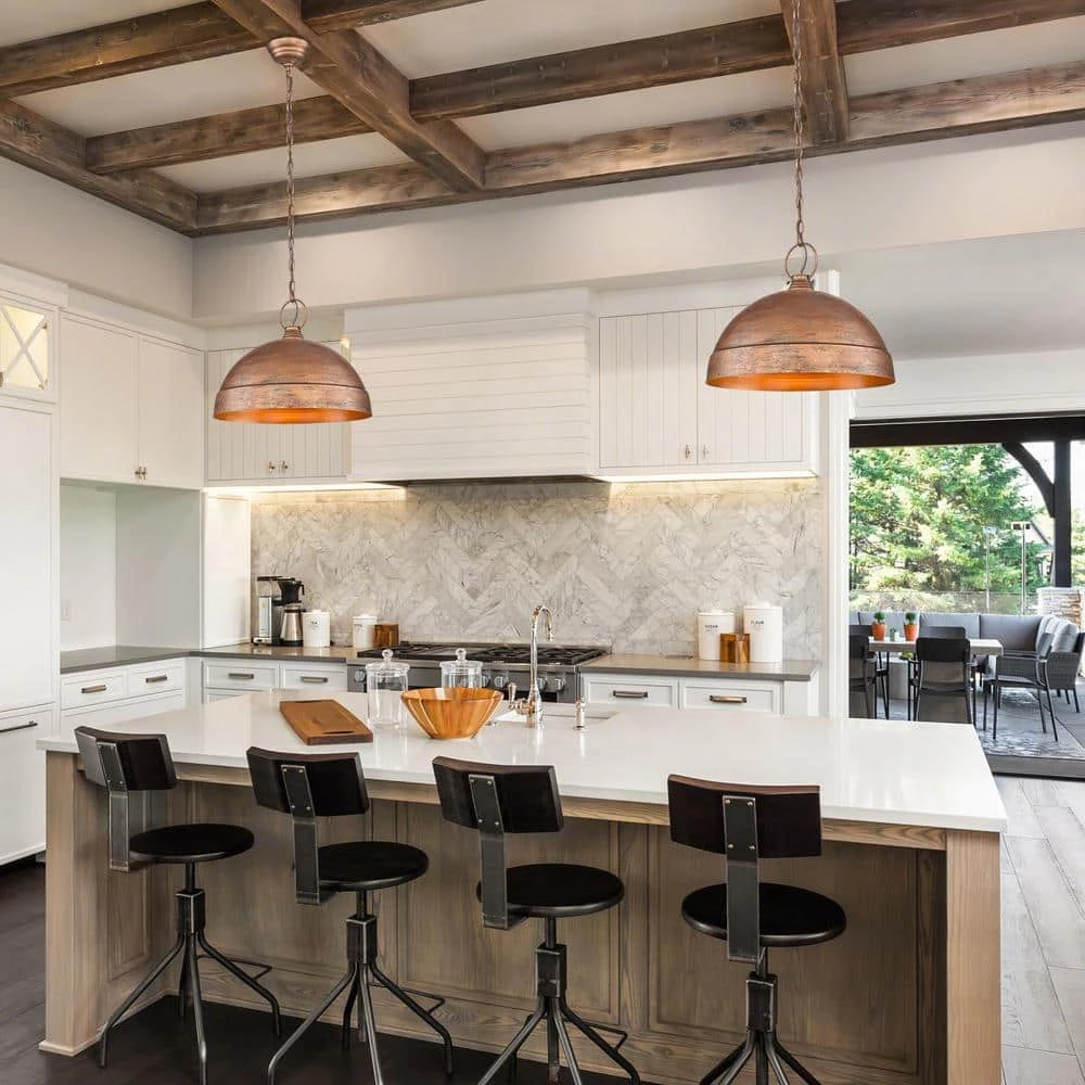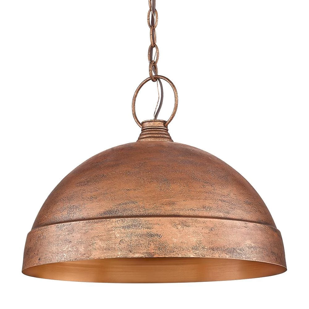Add a touch of industrial-inspired charm with the Lincoln dome pendant. Transitional in style, the light is timeless and fit for various interiors. Its beauty lies in honest and unabashed simplicity. The shade is hand-painted in layers and is textured in order to have a weathered, rustic appearance. The base layer is done in a metallic copper color like a shiny new penny, then partially covered with layers of brown and charcoal. The shade’s interior is painted a coppery color to coordinate with the exterior. The large, classic shade balances on a tiered top cap and a matching length of sturdy chain. This pendant is perfect for task lighting. Hang one alone or group with others above a kitchen island.