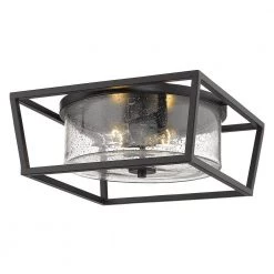 With seeded glass and a contemporary finish, the simplicity of the Mercer Collection is suitable for transitional to modern interiors. Bold, graphic lines in matte black create the open cage design. The fixtures are available in multiple accent colors to match or contrast the smooth cages. This flush mount provides widespread ambient lighting.