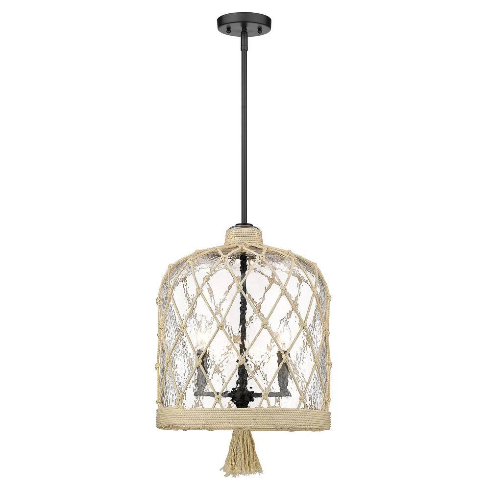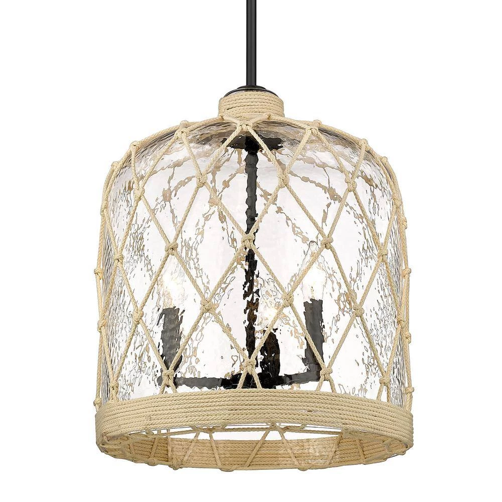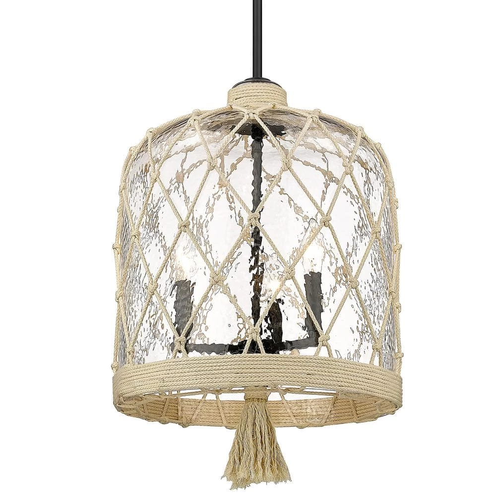 Enhance your coastal space with Nassau. Authentic fishnet knots in a clean white rope wrap the hammered clear glass shade. The rope finishes just before the glass bottom, resting atop 1 another. The hammered glass shade’s open bottom has a clean look. The larger light within this collection offers an optional fringe tassel.
