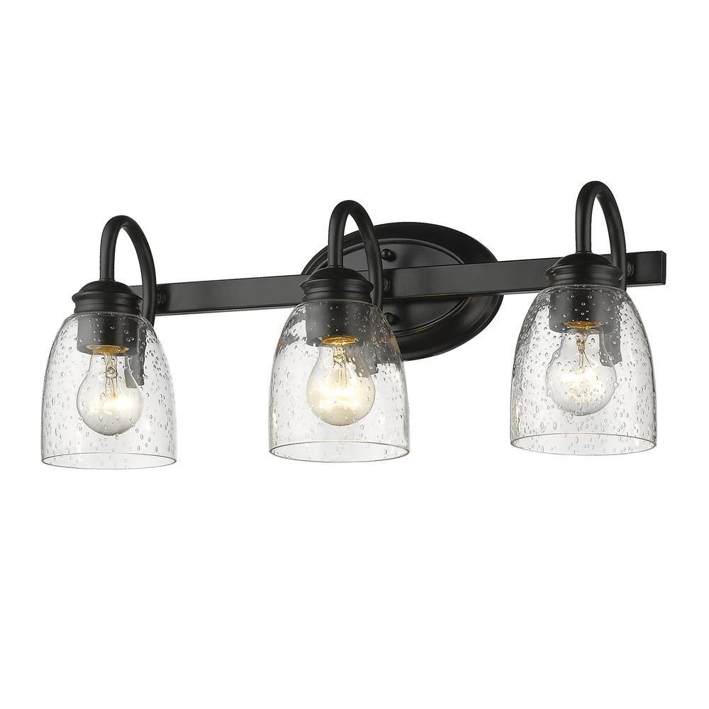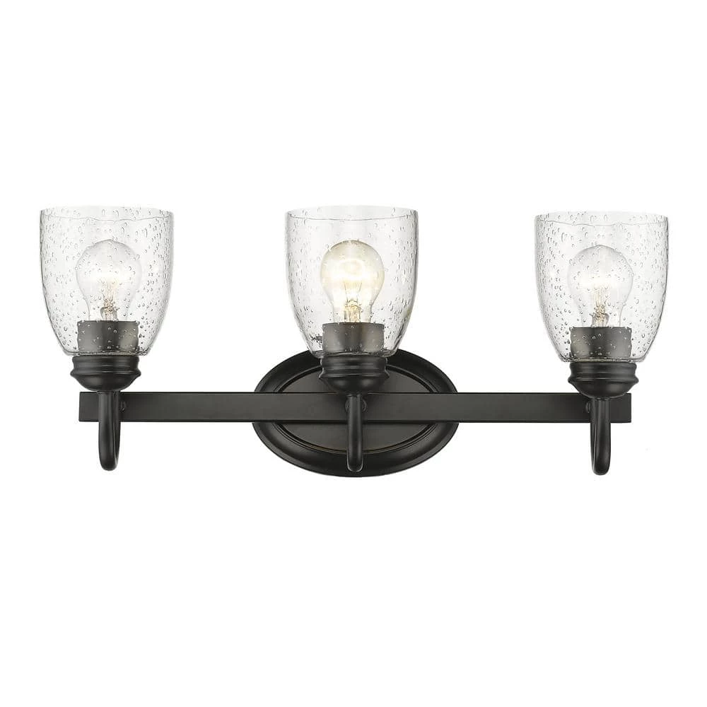 Simple and elegant the Parrish collection is a lovely blend of masculine and feminine, old and new. A versatile, smooth black finish overlay the graceful, traditional arms. Matching socket covers add a touch of color to the clear, textured seeded glass. The contemporary shape of the glass and simple finish gives this otherwise classic silhouette a modern update. Perfect for traditional to transitional interiors, this charming collection is a timeless beauty. This family offers a variety of fixtures to suit all of your interior lighting needs. This 3-light bath vanity is UL approved for damp locations and will provide well diffused light over a vanity or mirror.