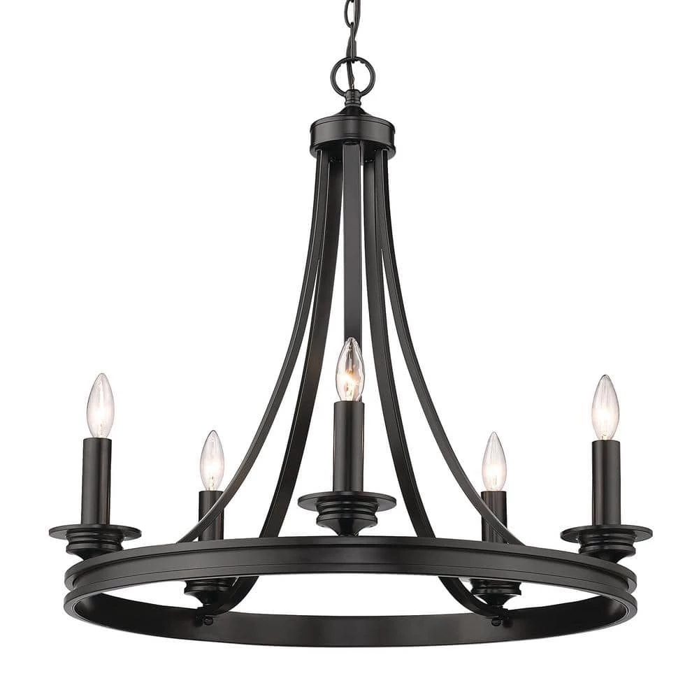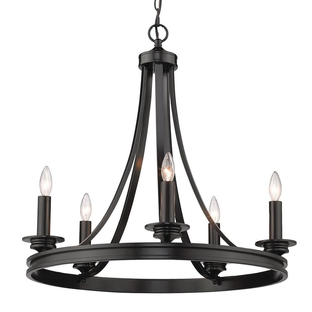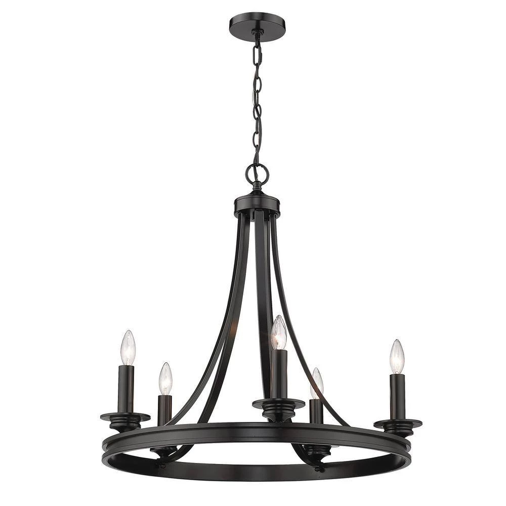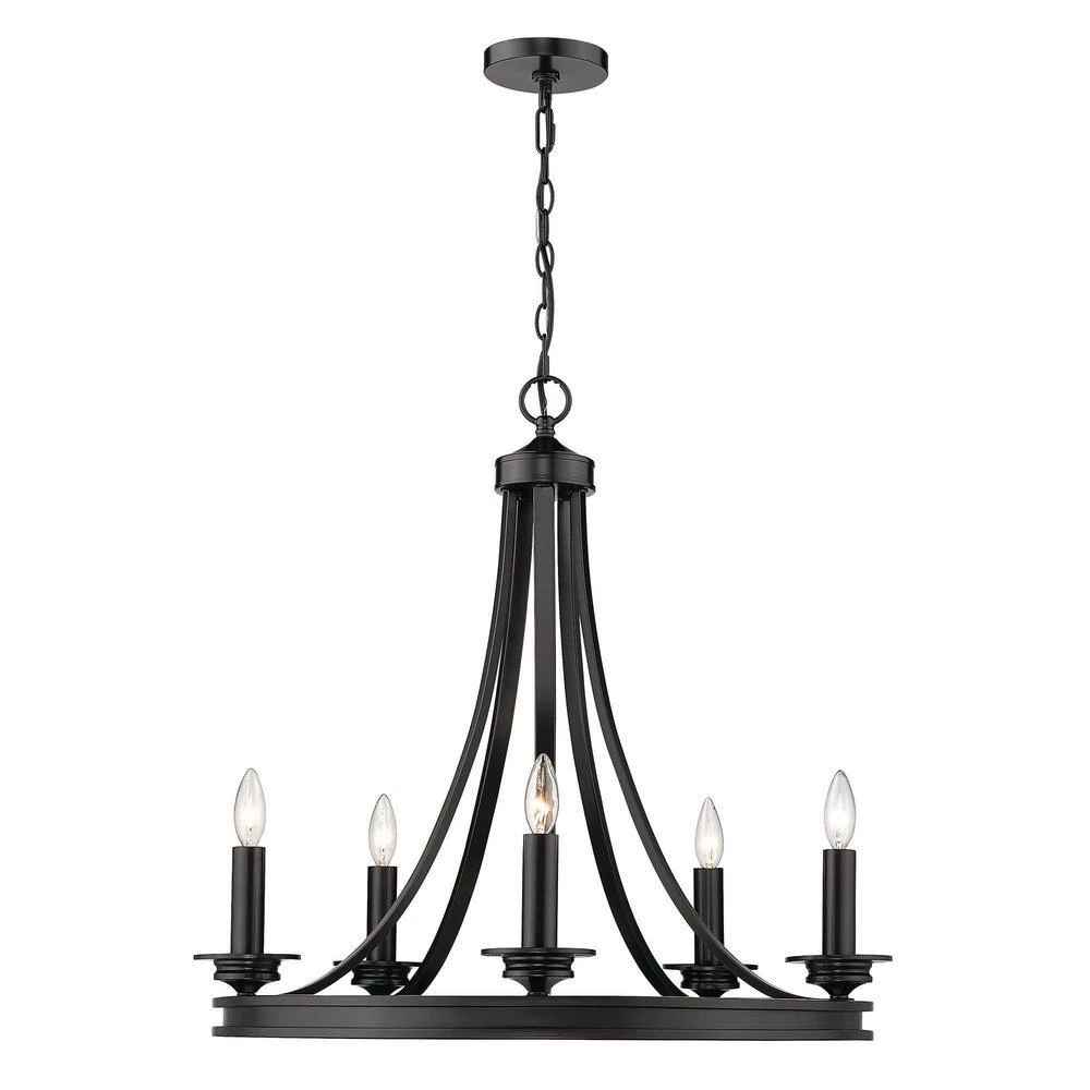 Transitional and unobtrusive, Saldano features the clean look of candles balanced on a simple ring. With a smooth, matte black finish, this 5-light chandelier provides a modern update in a classic form that is both timeless and versatile. Saldano has a sturdy steel construction that provides extra-durability.