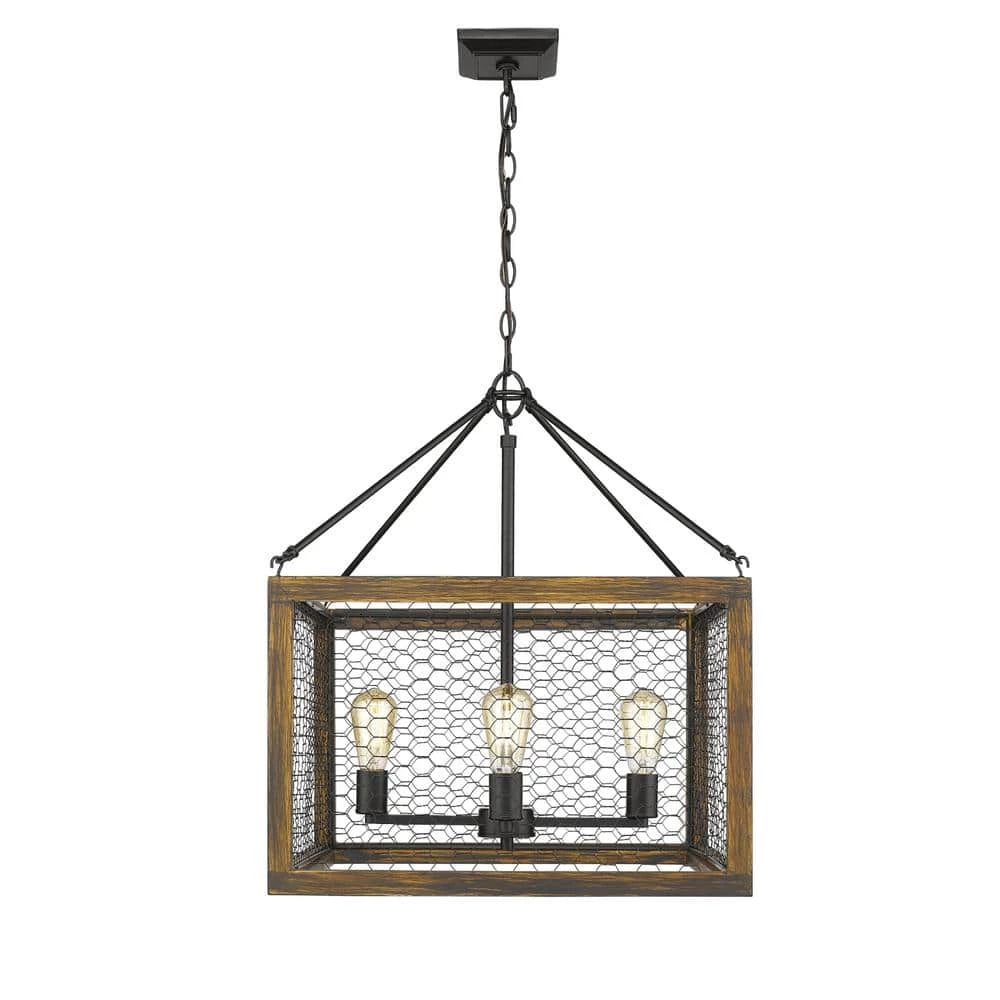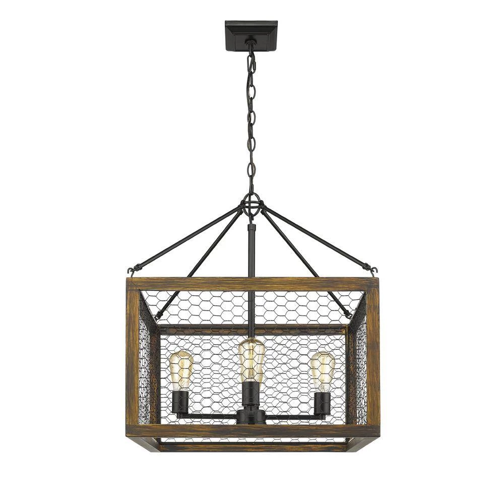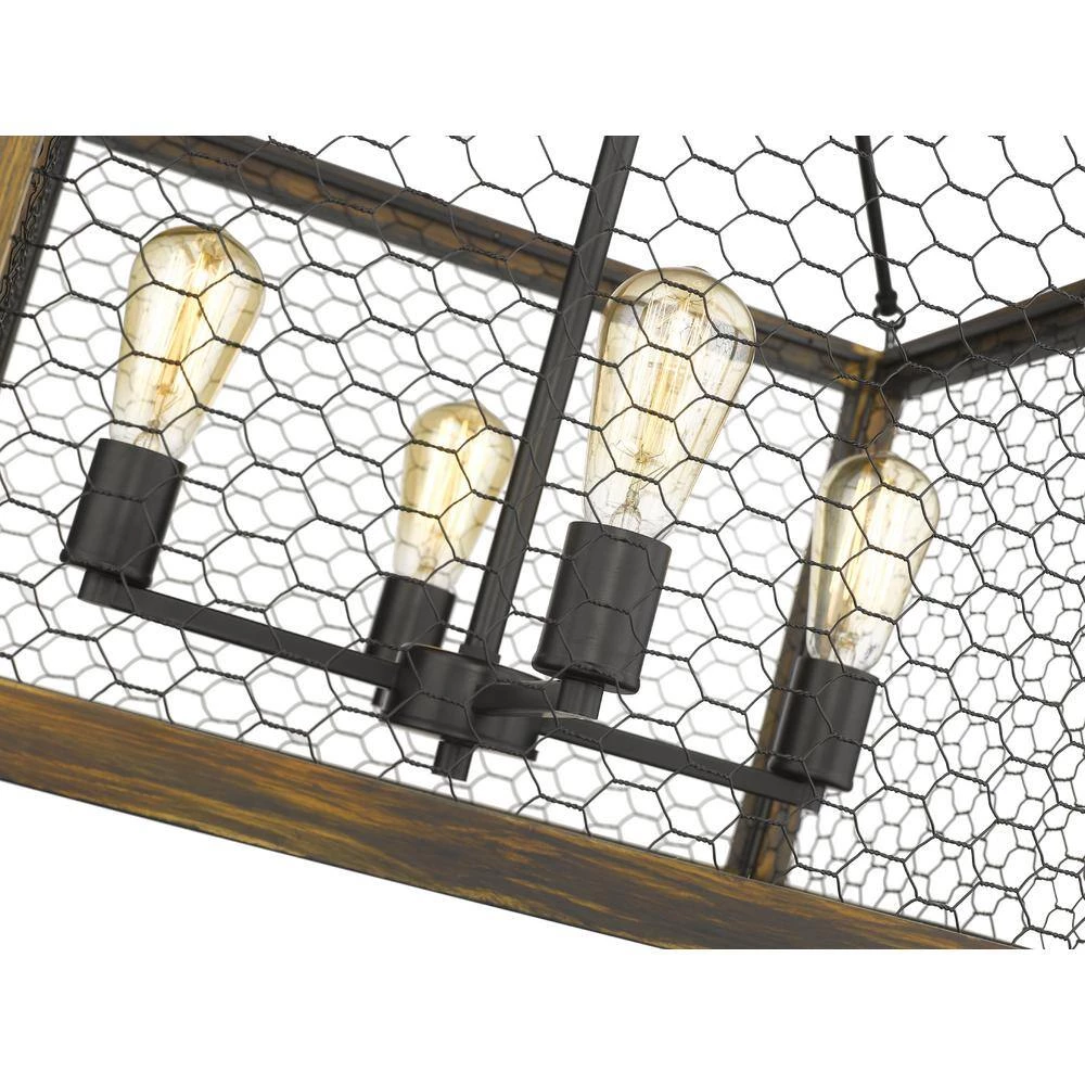 Sutton is a modern but rustic collection with a smooth black cluster, wood cage, and wire panels. The farmhouse-chic look is enhanced by the exposed medium-based bulbs inside the rugged wood frame. Complete the look by installing trendy, Edison Bulbs. This 4-Light chandelier’s cage and ambient light makes it perfect for large open spaces, while its height allows it to fit comfortably in rooms with 8-9 ft. ceilings. The wire panels cast warm and interesting shadows creating a statement piece everyone will be talking about.