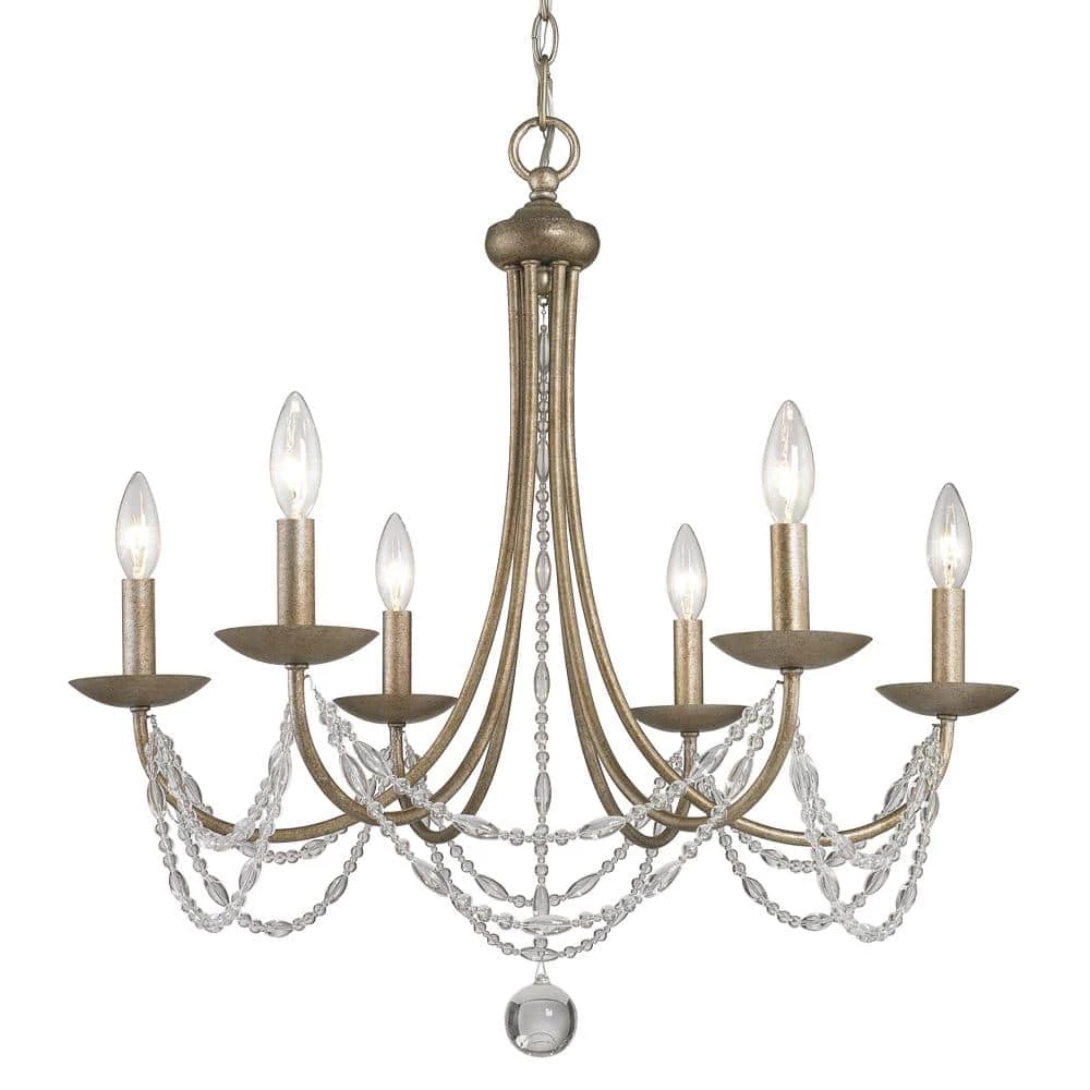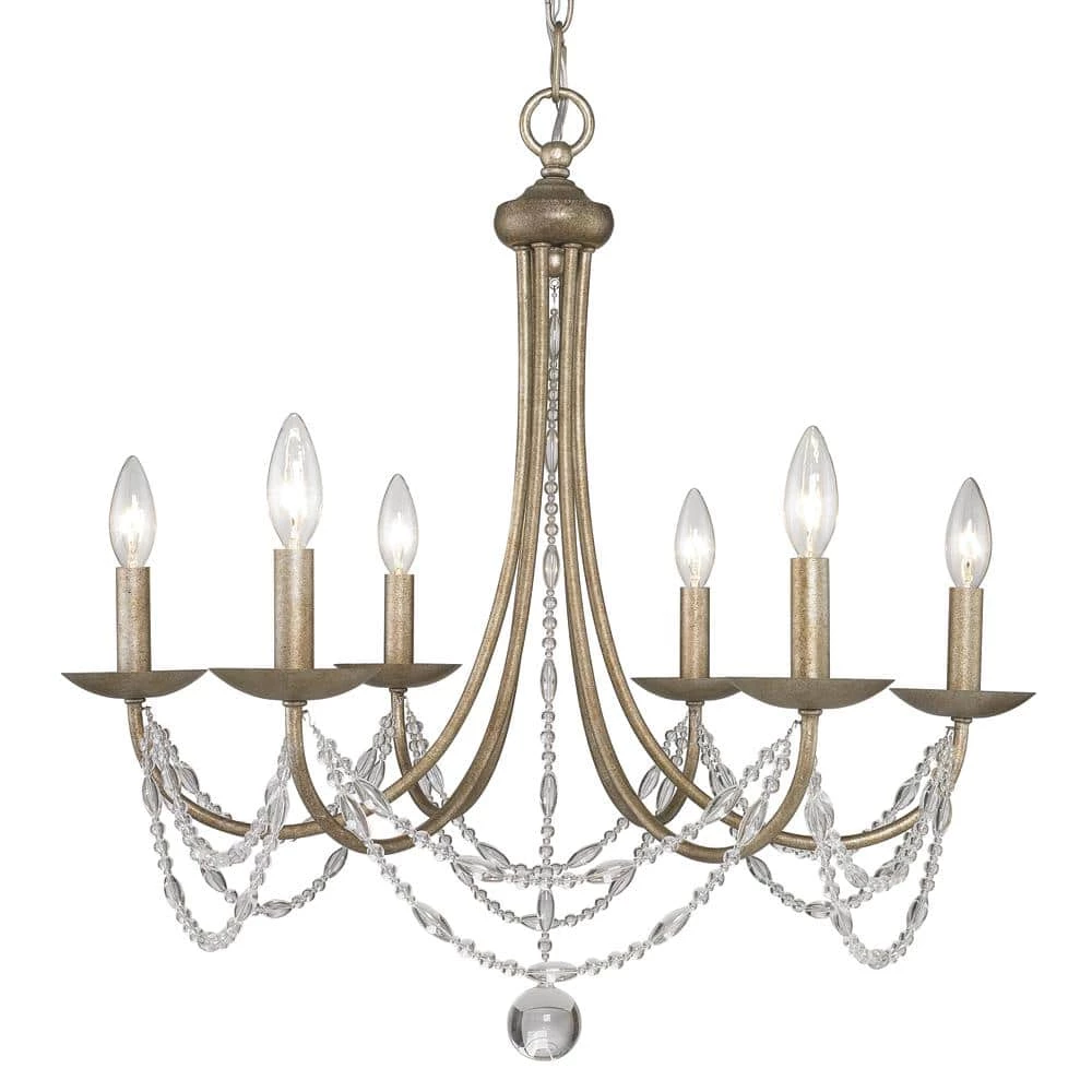 Reminiscent of vintage Hollywood glamour, the Mirabella collection dresses the traditional home in high fashion. Graceful sweeping arms with a Golden Aura finish reveal layers of soft gold and silver undertones. Each piece is accessorized with drapes of crystal-Clear Glass beads and may be stylishly appointed with sheer, hand-wrapped Pearl Chiffon shades (purchased separately).This 6-light chandelier creates a stylish focal point perfect for intimate living and dining areas.