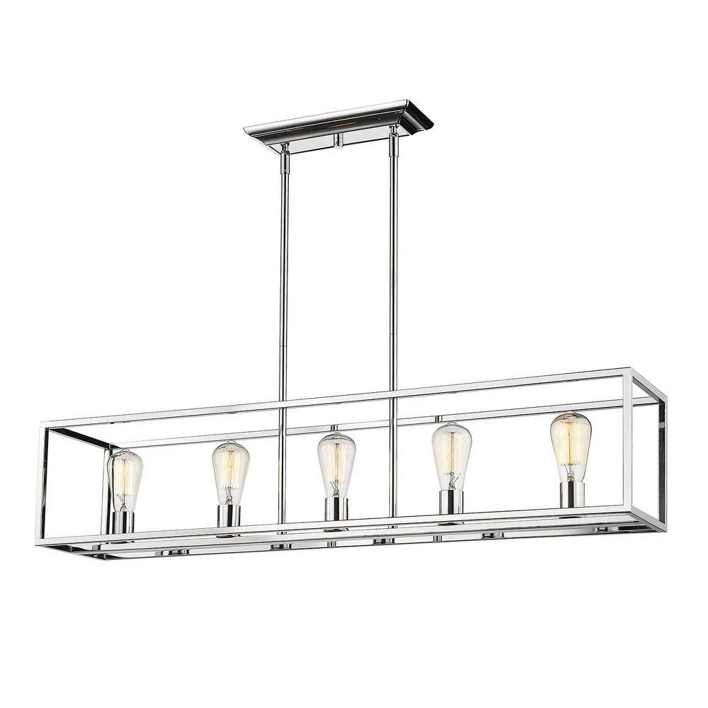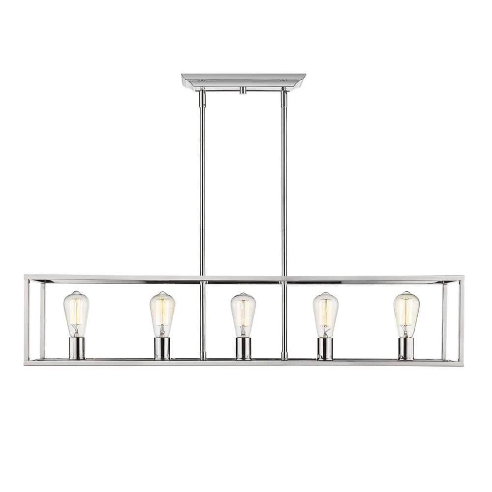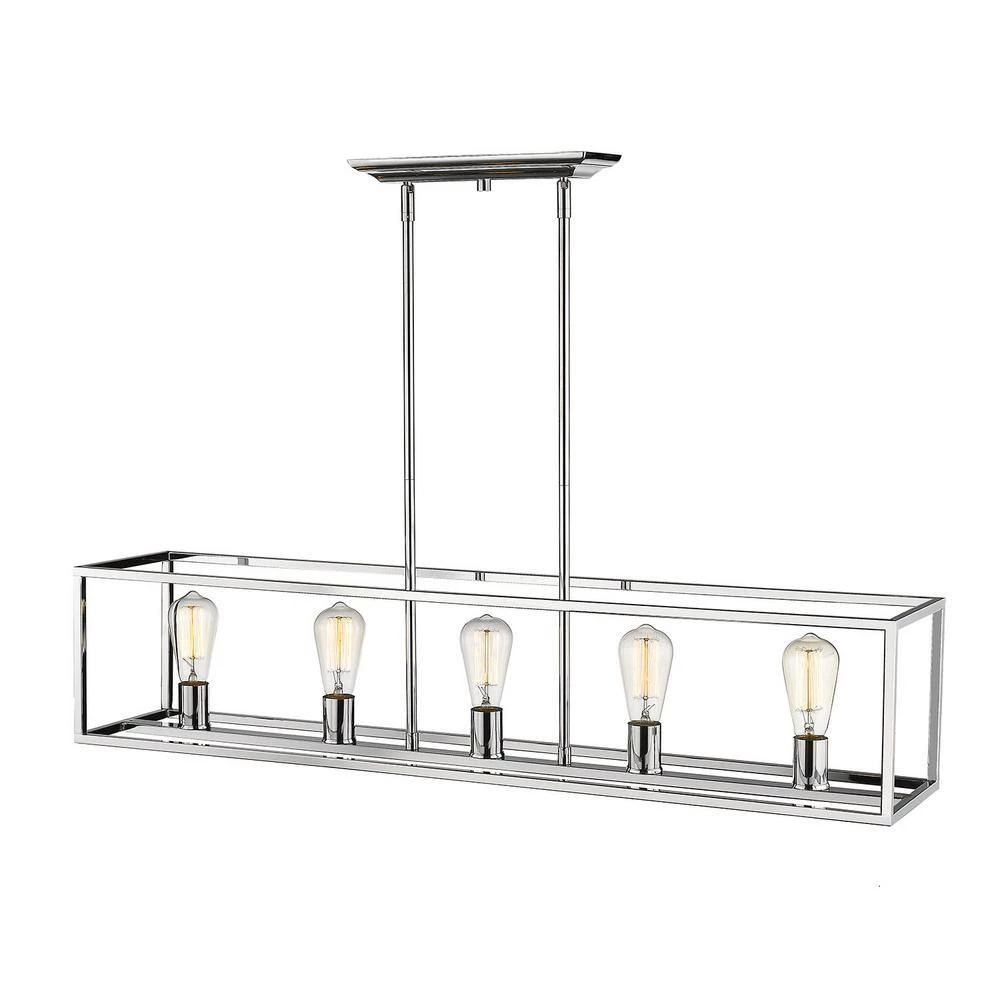 Wesson is a clean contemporary collection with a chrome finish. The industrial look is enhanced by the exposed medium-based bulbs inside the square tubing of the open, geometric cages. Complete the modern, rustic look by installing Edison Bulbs. This 5-Light linear pendant perfectly illuminates an elongated bar, dining tableor kitchen island.