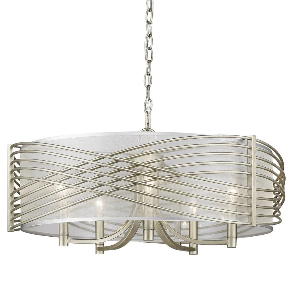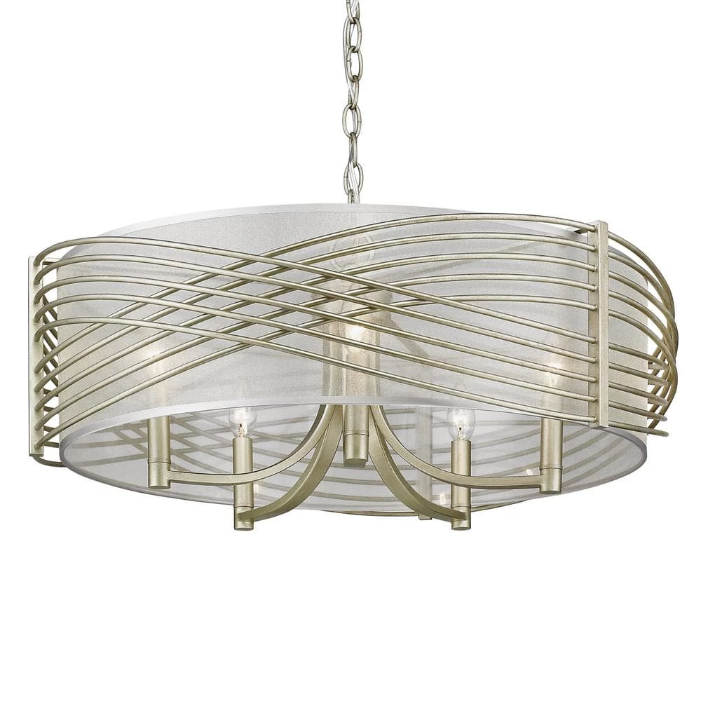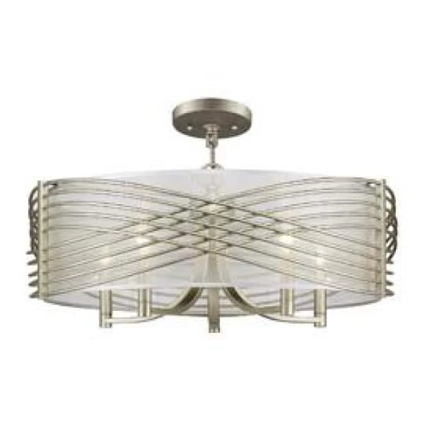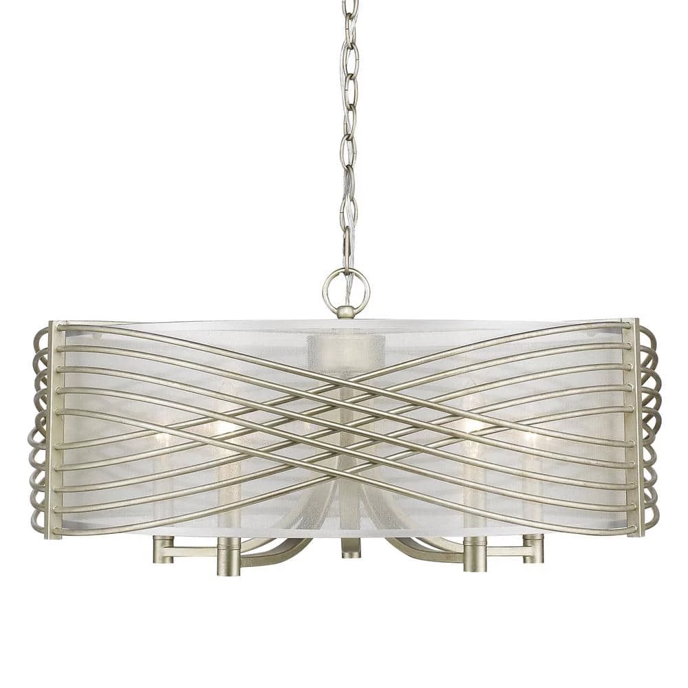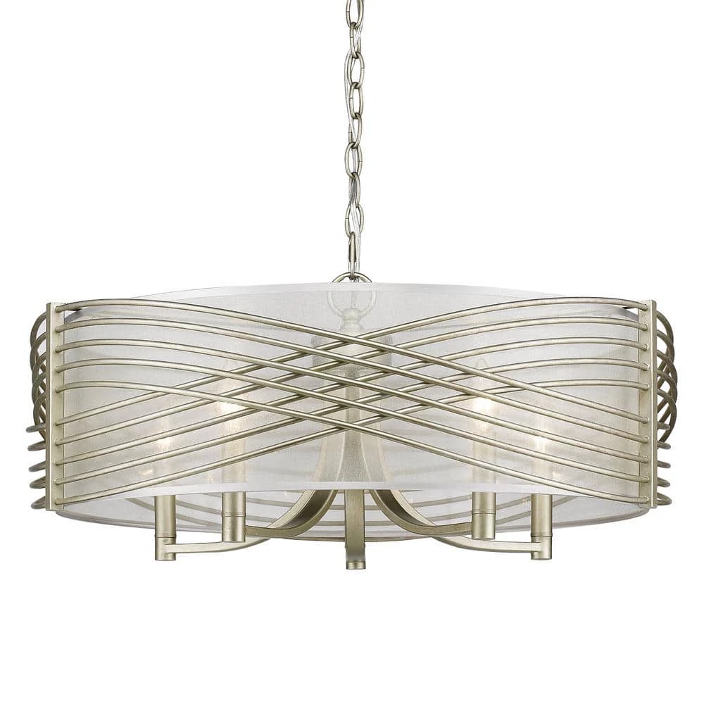 Zara is a fashionable, transitional style. Thin bands of steel in a soft, White Gold finish flow elegantly around a sheer fabric shade in a unique, cross-woven design. The bold rectangular arms are echoed by the rectangular supports of the metal shade. This strong geometry is softened by the Sheer Opal Shade. This 5-light chandelier creates a stylish focal point. Its height is perfectly sized for 8 or 9 ft. ceilings.